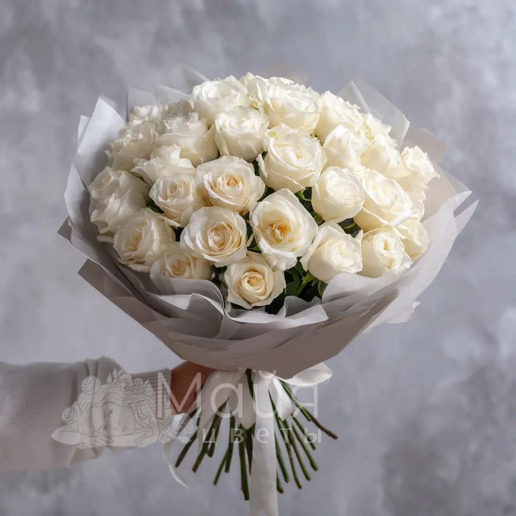 Белые розы в приглушённой палитре и упаковке цвета тумана — для создания атмосферы загадочности и элегантности. Такой букет говорит о глубине и осознанности чувств.