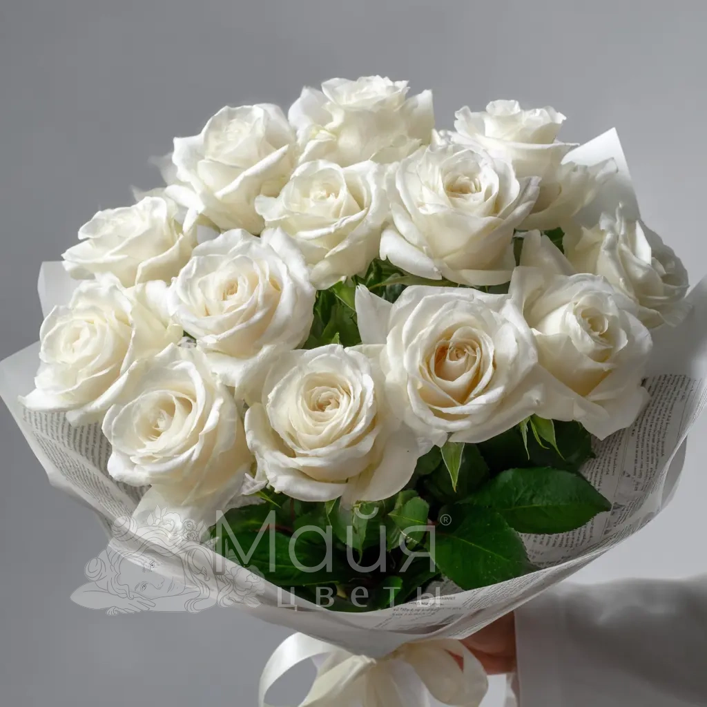 Белоснежные розы в холодной палитре — для ценителей минимализма и лаконичности. Эстетичный и сдержанный букет, который подойдёт как для деловых поздравлений, так и для трогательных моментов.