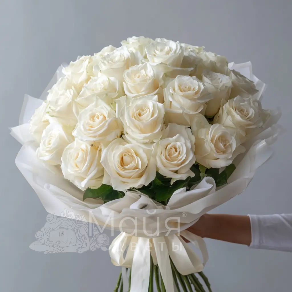 Нежный и лёгкий букет из белых роз, словно облака с каплей утреннего аромата. Прекрасен как подарок для романтических случаев или в качестве комплимента без повода. Сочетает свежесть и деликатность.