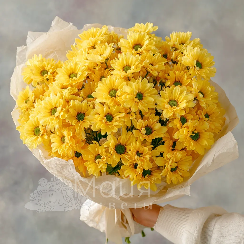 Яркий и солнечный букет, наполненный жизнерадостной энергией. Кустовые хризантемы образуют пышную и живую форму — отличное решение для доброго утреннего подарка или поздравления друга.