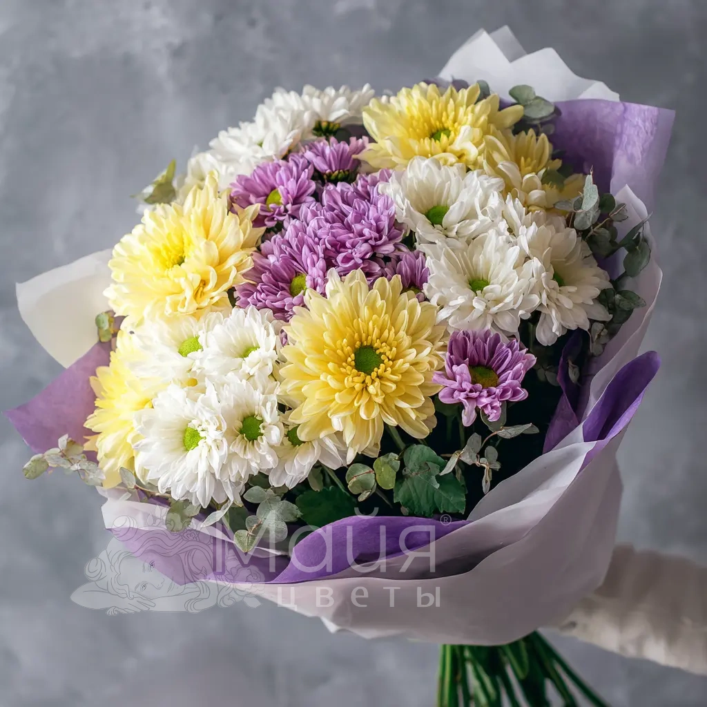 Нежный букет в пастельных сиреневых тонах с акцентами солнечного жёлтого и чистого белого. Создаёт ощущение лёгкости и утренней свежести. Отлично для подарка с романтическим подтекстом или в знак благодарности.