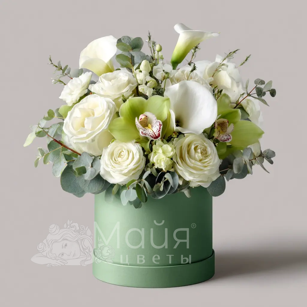 Зеленые орхидеи, каллы и эвкалипт — элегантная композиция для ценителей красоты и изящества.
