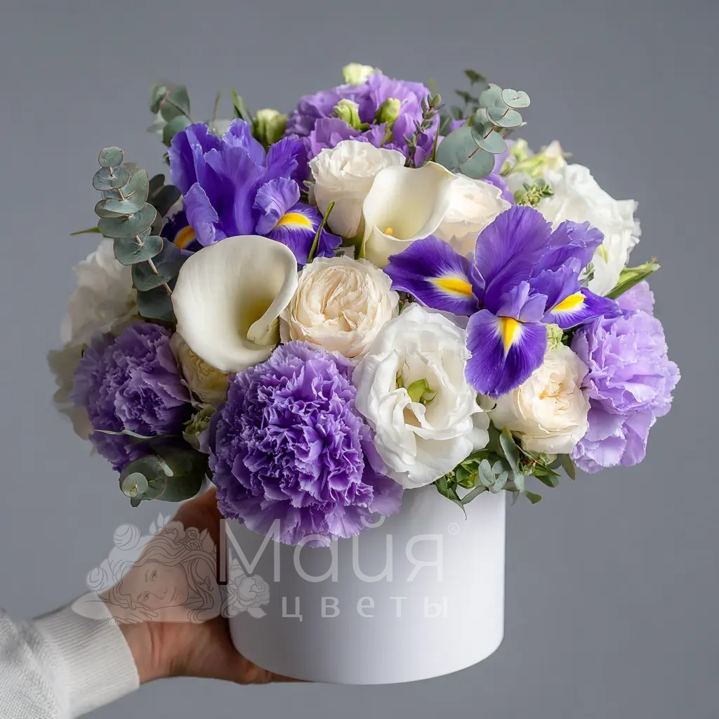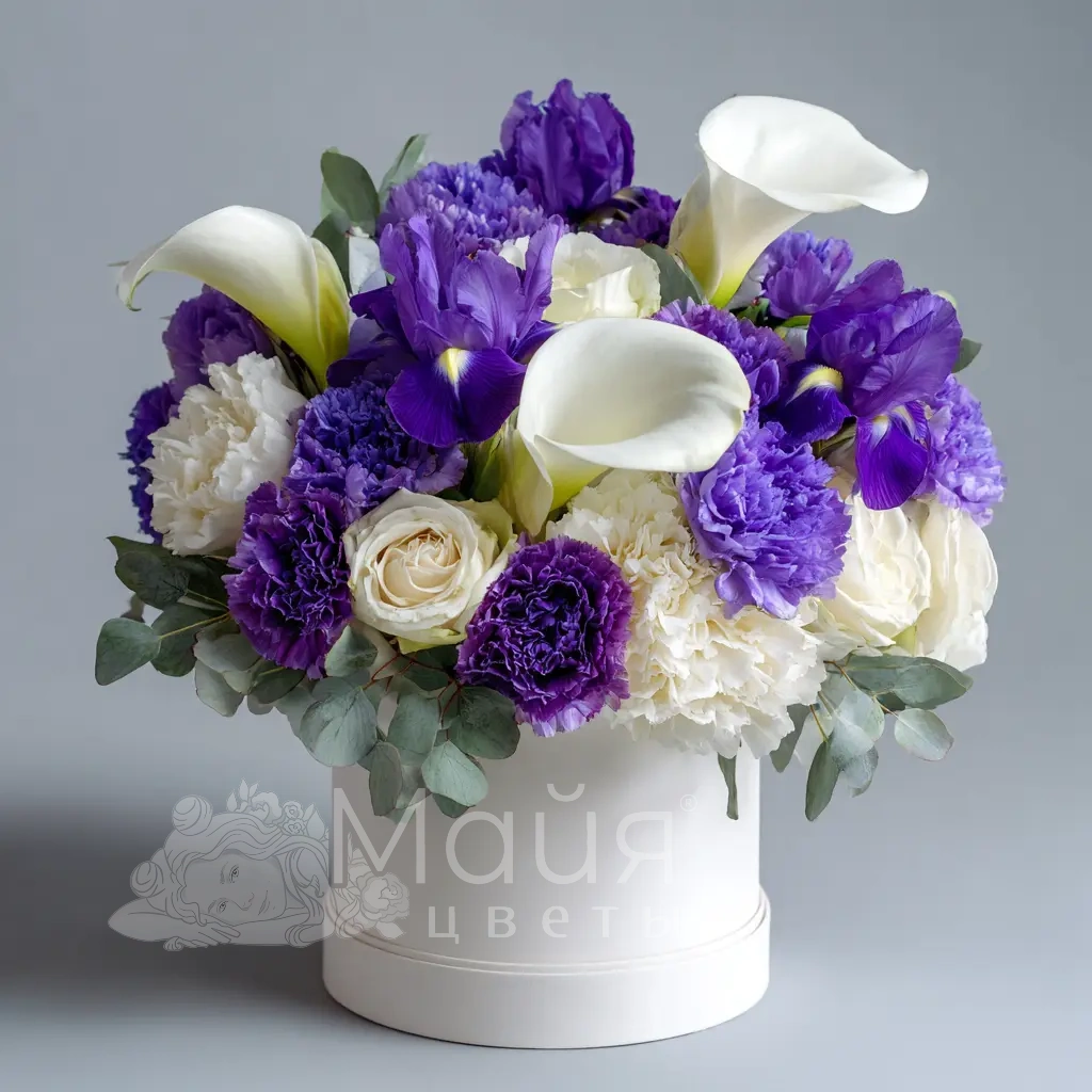Белые каллы, фиолетовые ирисы и гвоздики создают мягкую, романтичную атмосферу для особых вечеров.