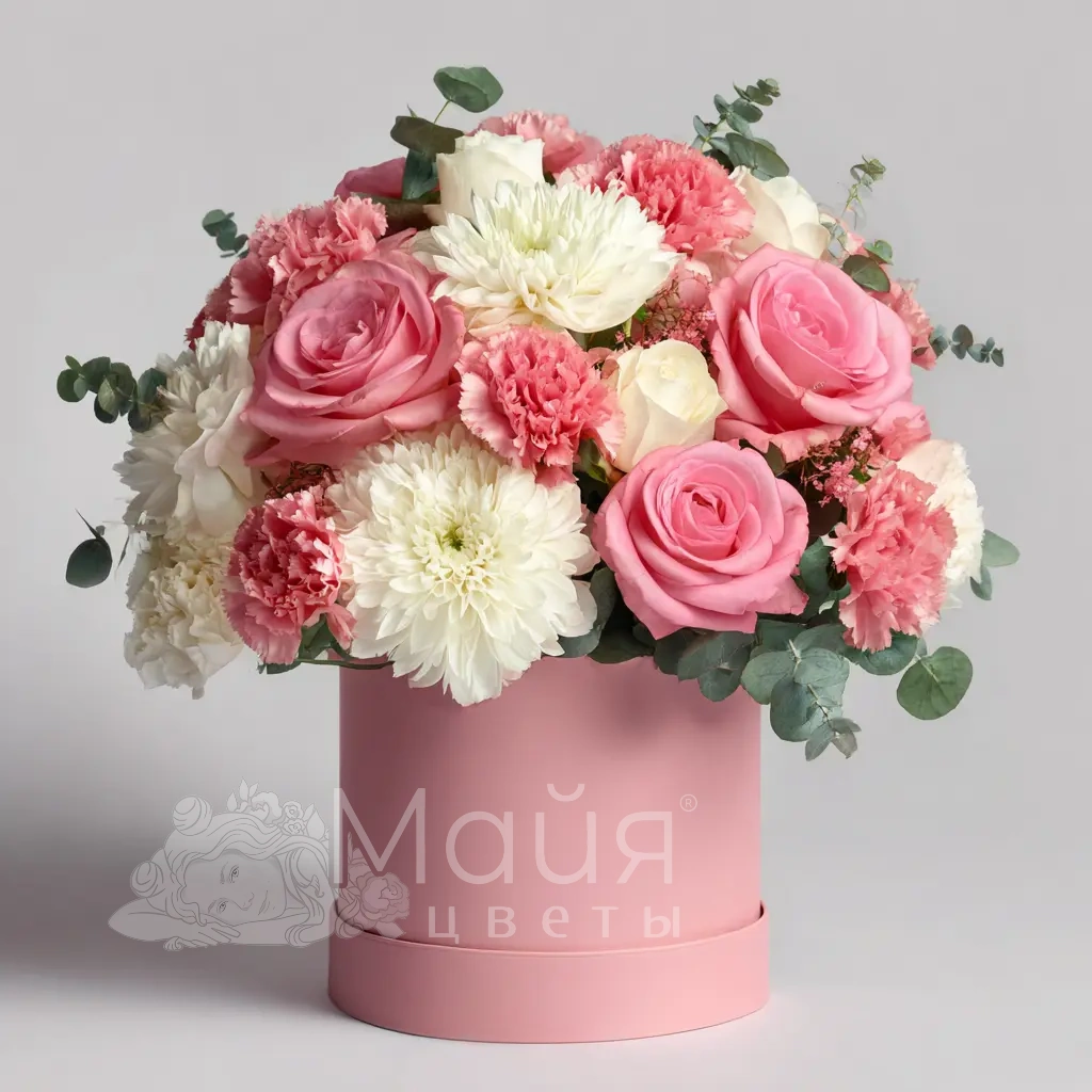 Розовые гвоздики, белая хризантема и розовые розы — яркая композиция для праздничных событий и поздравлений.