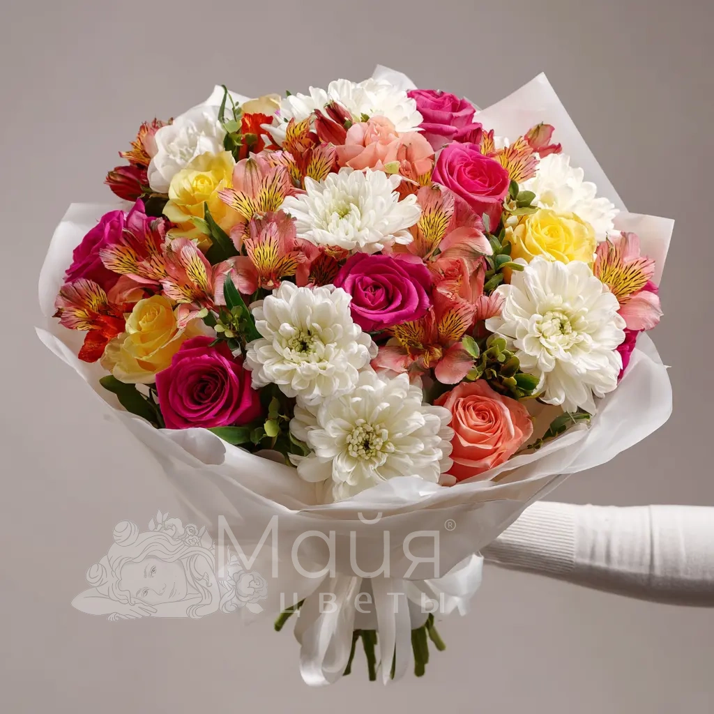 Эффектный букет, в котором альстромерии раскрываются во всей палитре. Яркие, насыщенные краски привлекают внимание и создают праздничную атмосферу. Идеален для запоминающегося сюрприза.