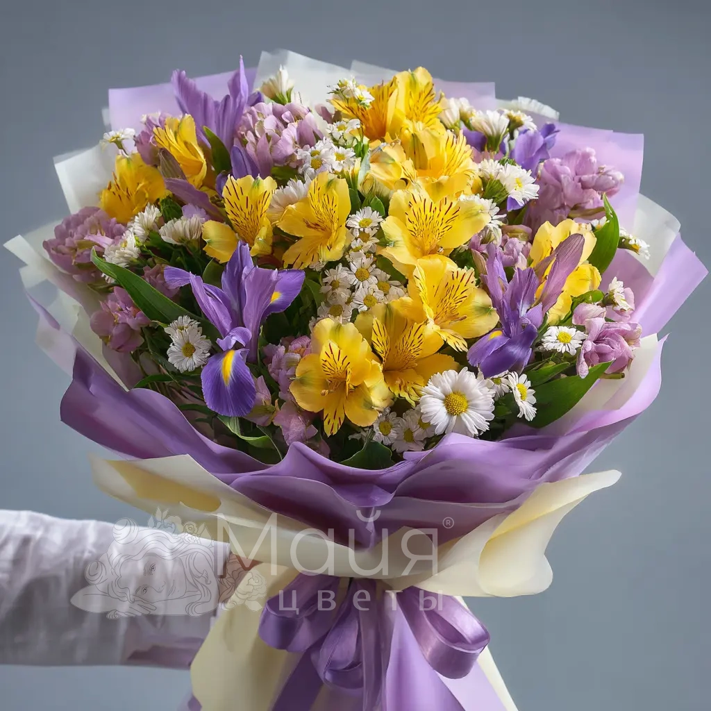 Композиция в жёлто-фиолетовой гамме — как всплеск света в пасмурный день. Альстромерии создают ощущение тепла и оптимизма. Прекрасно подойдёт для поднятия настроения или неожиданного подарка.