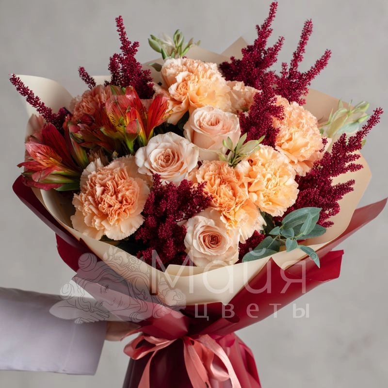 Кремовые гвоздики с бордовыми цветами — загадочный и благородный букет, создающий атмосферу роскошного вечера и незабываемого момента.