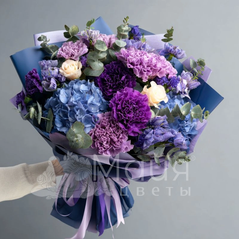 Фиолетово-сиреневые гвоздики в сочетании с гортензиями переливаются, как ночное небо. Отлично подойдет для романтического вечера.