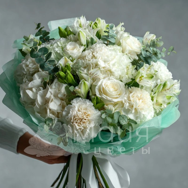 Лёгкий воздушный букет с нотками свежести создаёт ощущение прохлады. Отлично подойдёт для свадьбы, юбилея и дня рождения.