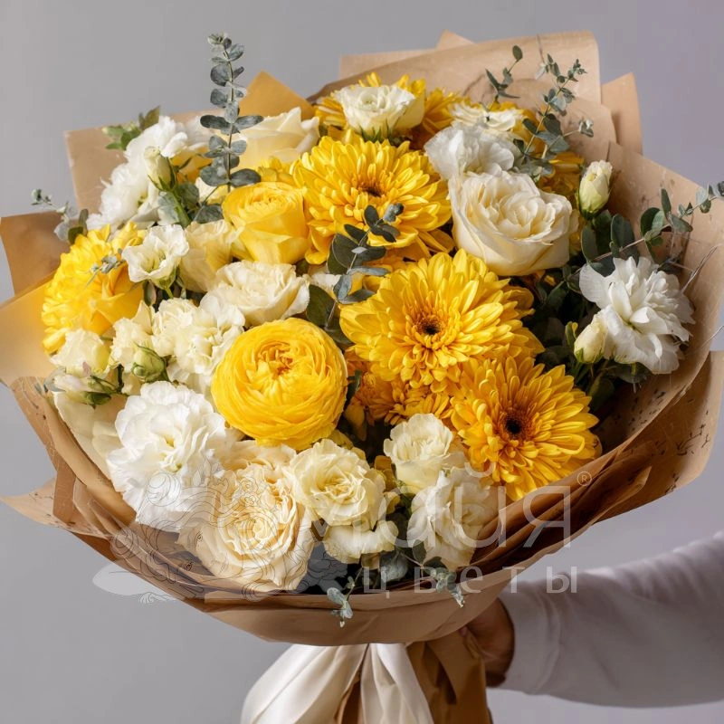 Яркий букет из хризантем в жёлтой и белой гамме — словно лучик солнца в пасмурный день. Он поднимает настроение, наполняет пространство светом и идеально подойдёт для подарка без повода.