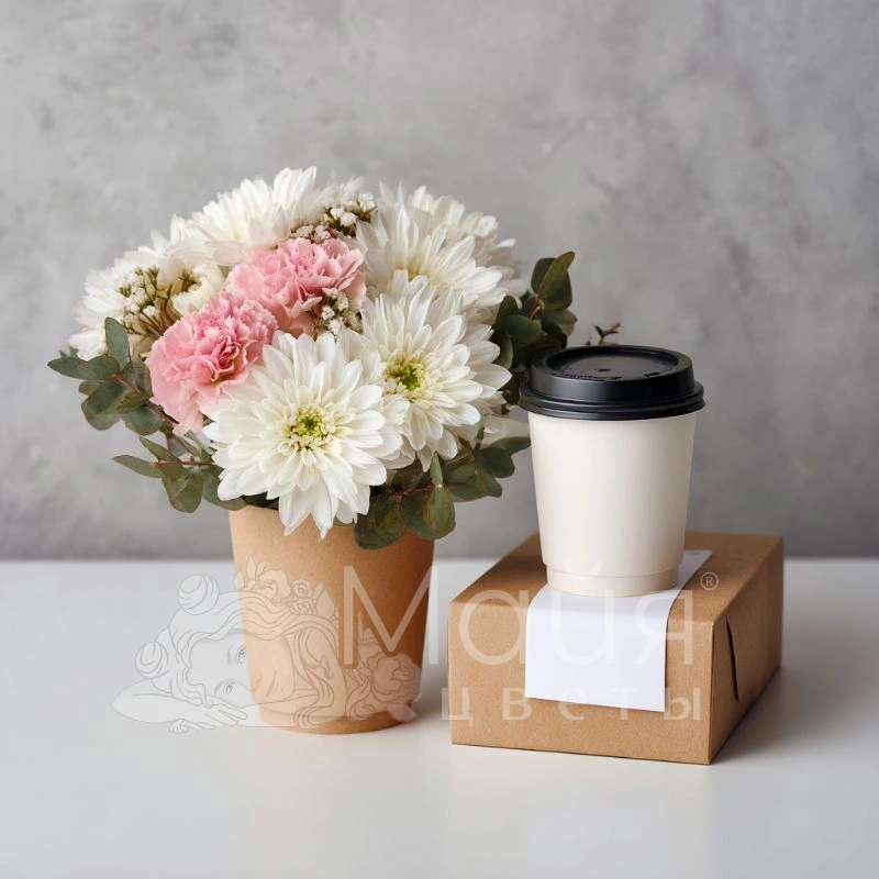 Нежная композиция живых цветов в кофейном стаканчике, дополненная ароматным латте в отдельном стакане. Идеальный подарок‑комплимент для тех, кто ценит утончённость в мелочах и тёплые эмоции.