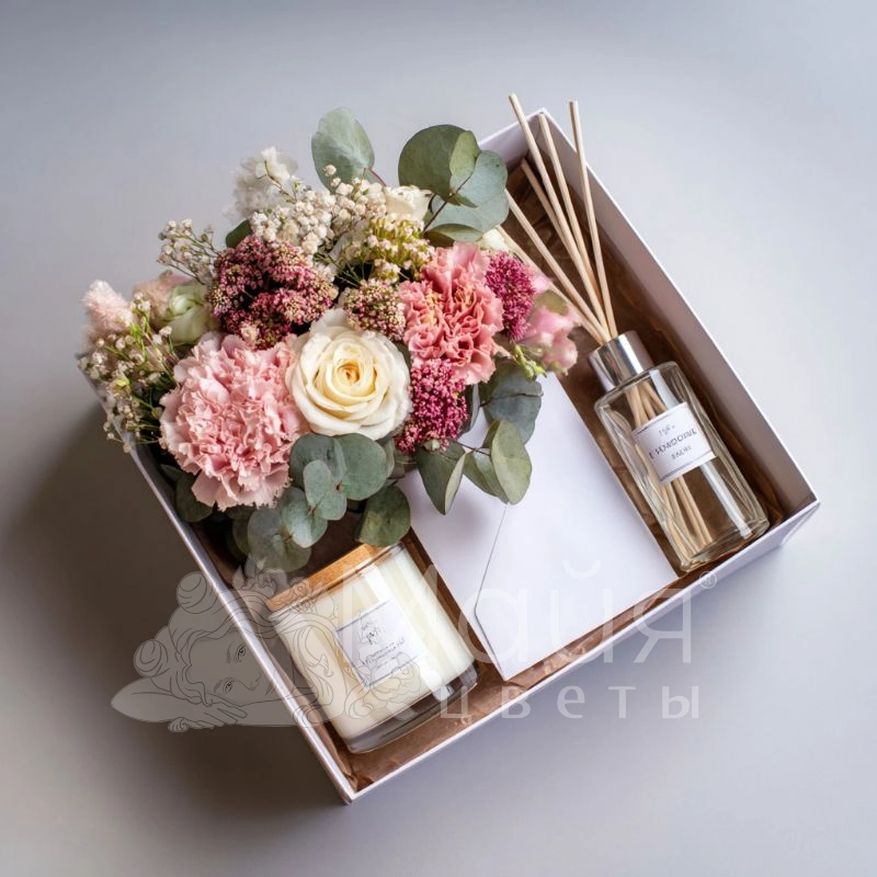 Этот набор, словно глоток чистого летнего воздуха, наполнит ваш дом лёгкостью и цветочной гармонией. Нежная флористическая композиция, интерьерная свеча и тонкий шлейф аромата из диффузора создадут атмосферу пробуждения и радости.