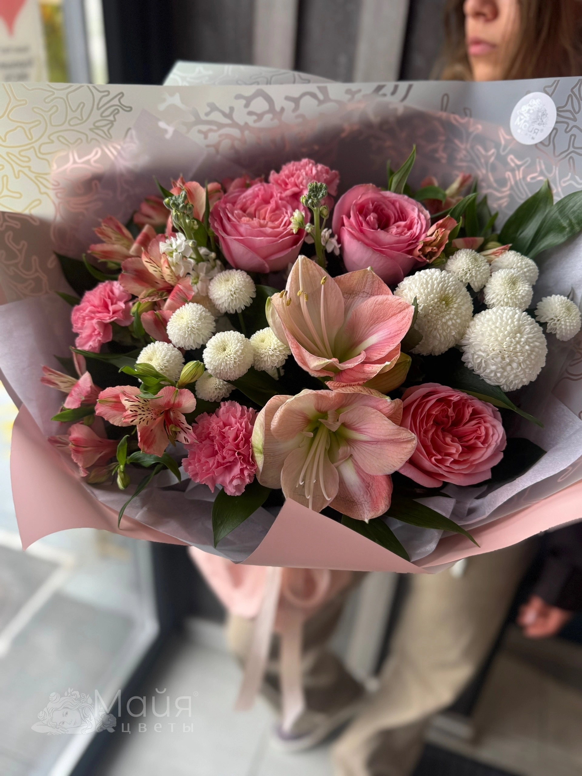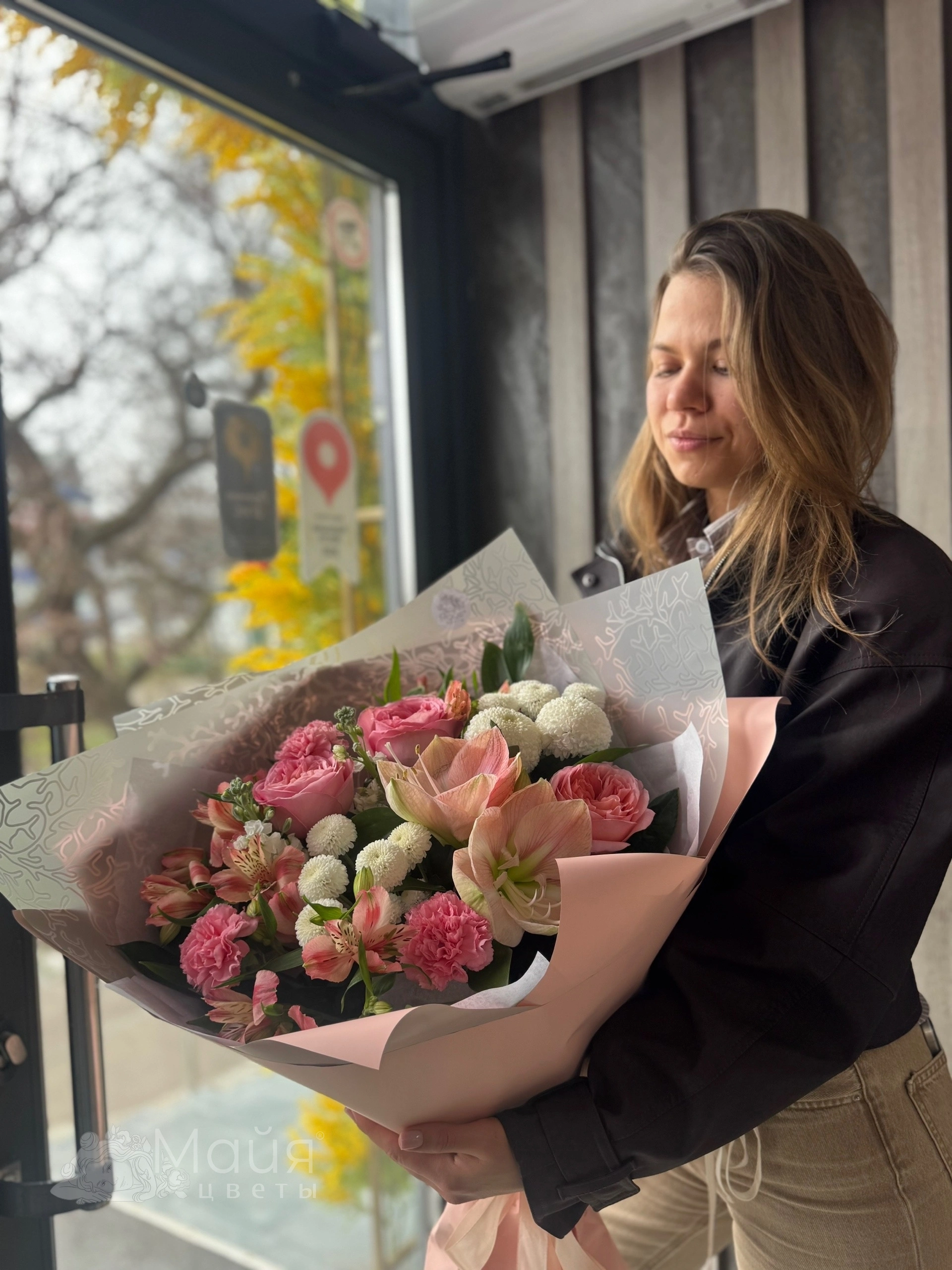Бережная доставка прямо в руки. Вышлем фото готового букета до доставки, сделаем фото с получателем (если получатель не против).