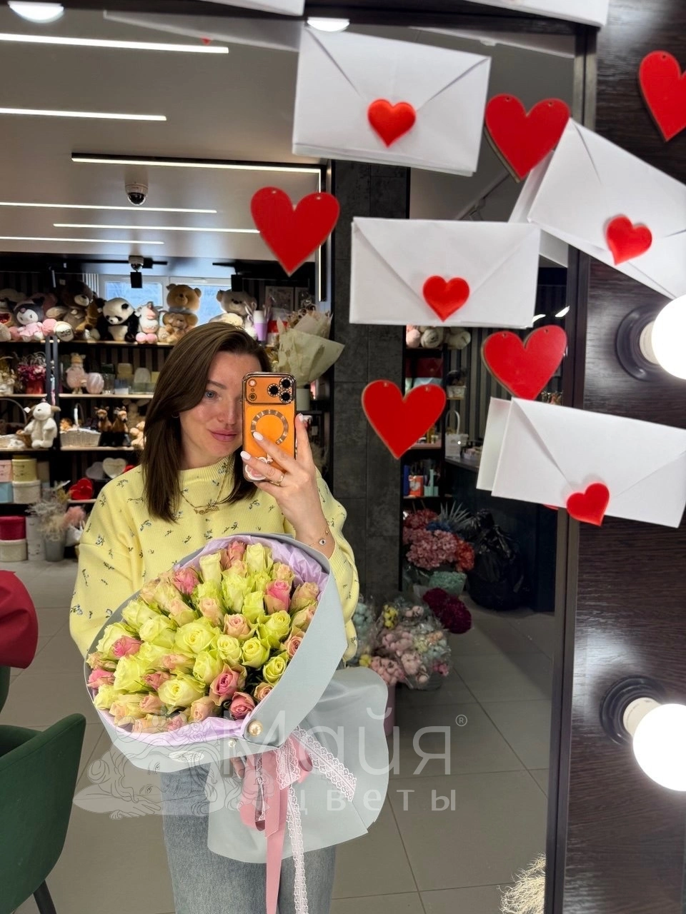 Бережная доставка прямо в руки. Вышлем фото готового букета до доставки, сделаем фото с получателем (если получатель не против).
