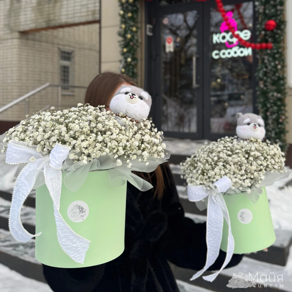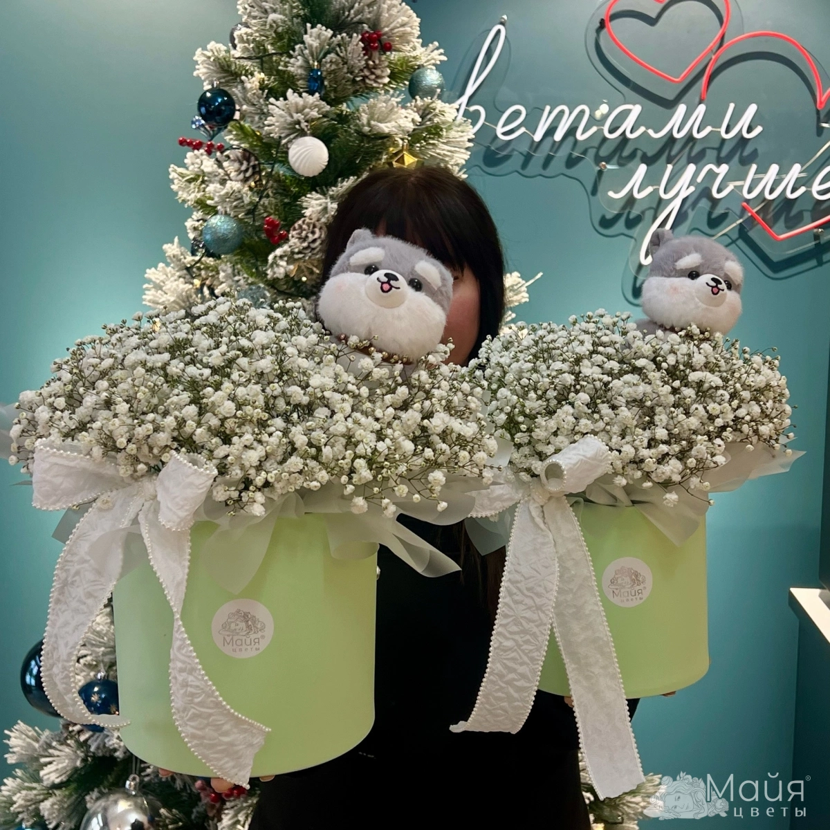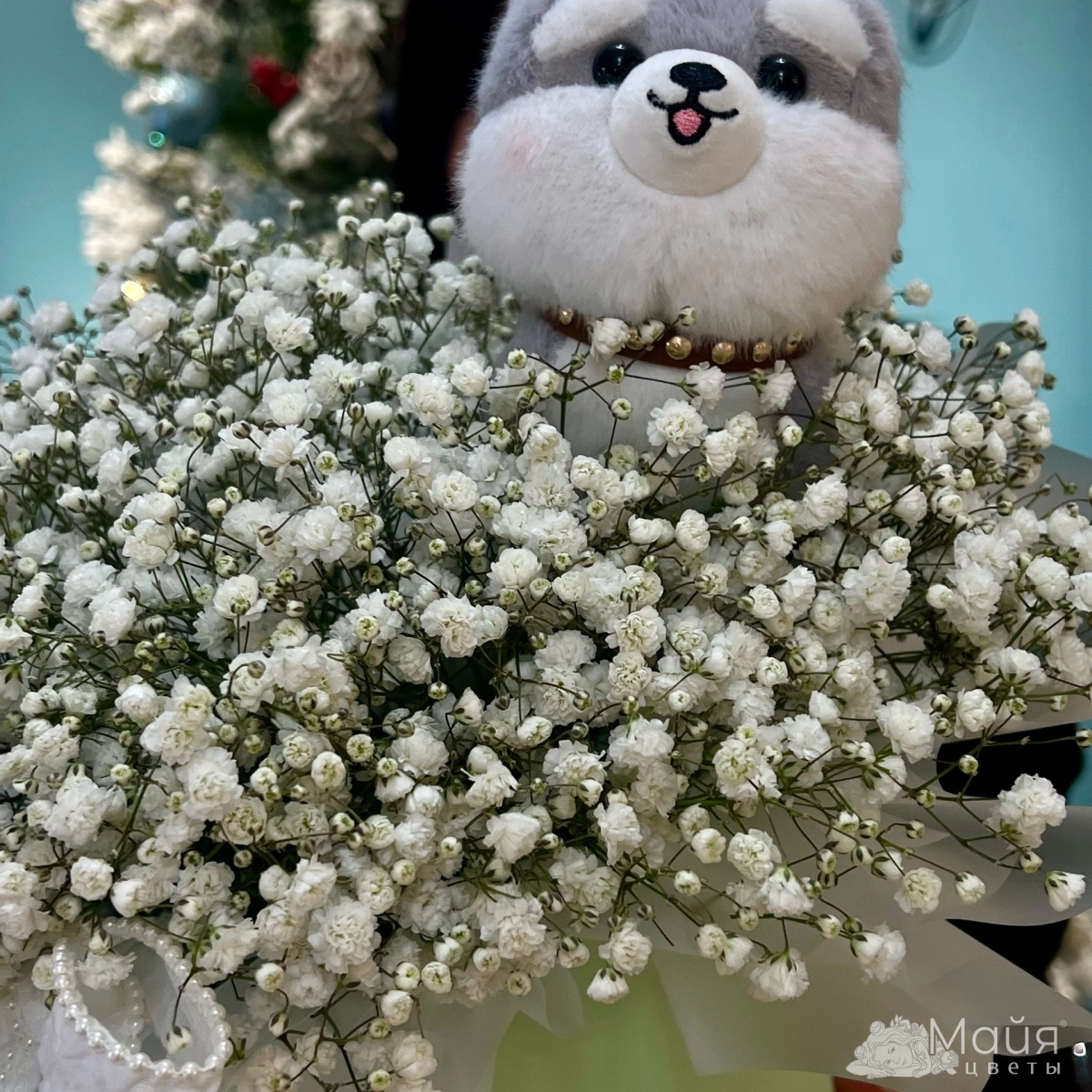 Главная Каталог Букеты Гипсофилы Композиция М « Гипсофила+ брелок собачка» 🐶