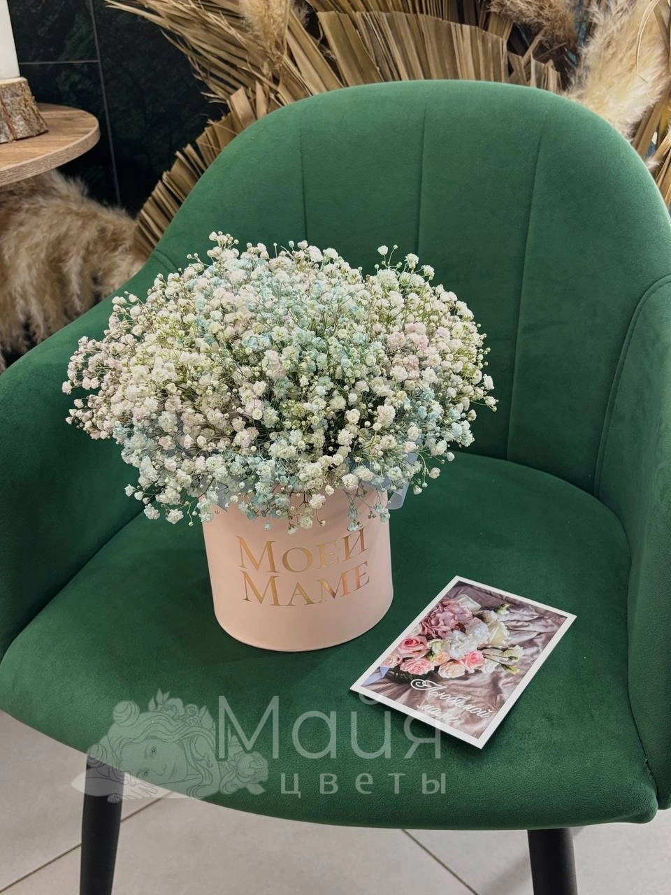 Гипсофила, Короб для композиций, Пиафлор, Открытка дизайнерская, Конфеты шоколадные "Raffaello"