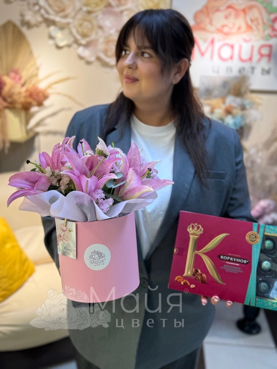 Лилия, Короб 16 см, Пиафлор, Статица, Эвкалипт, Открытка мини, Конфеты шоколадные "Коркунов"