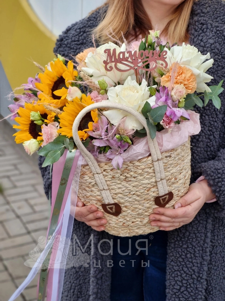 Подсолнух, Роза эквадор Playa Blanca 70 см, Альстромерия, Эустома, Гвоздика цветная, Пиафлор, Лукошко среднее, Лента, Упаковочная бумага, Ковыль, Колос, Топпер "Маме", Эвкалипт