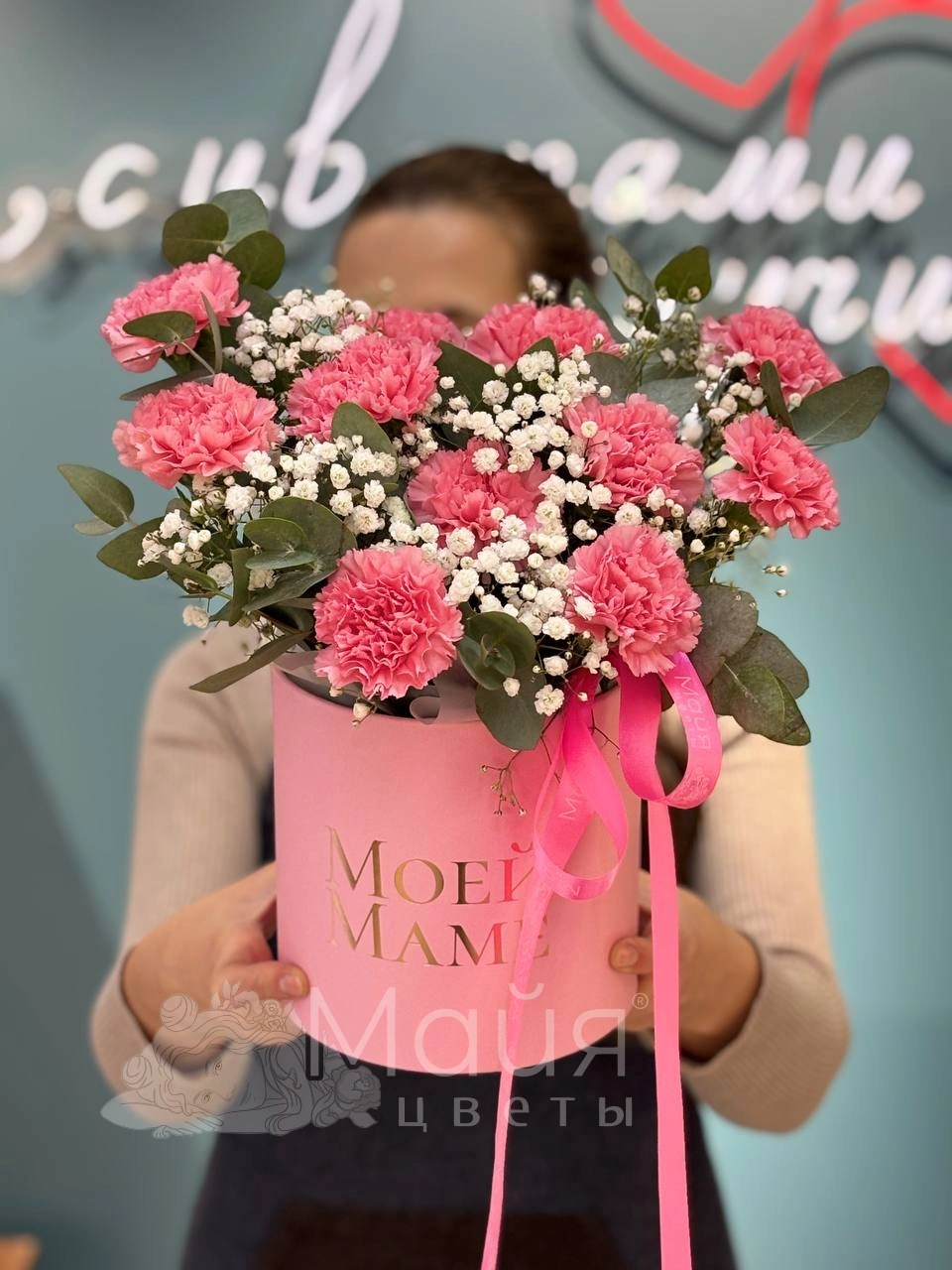 Короб 16 см, Гвоздика цветная, Эвкалипт, Пиафлор, Гипсофила, Упаковочная бумага, Лента