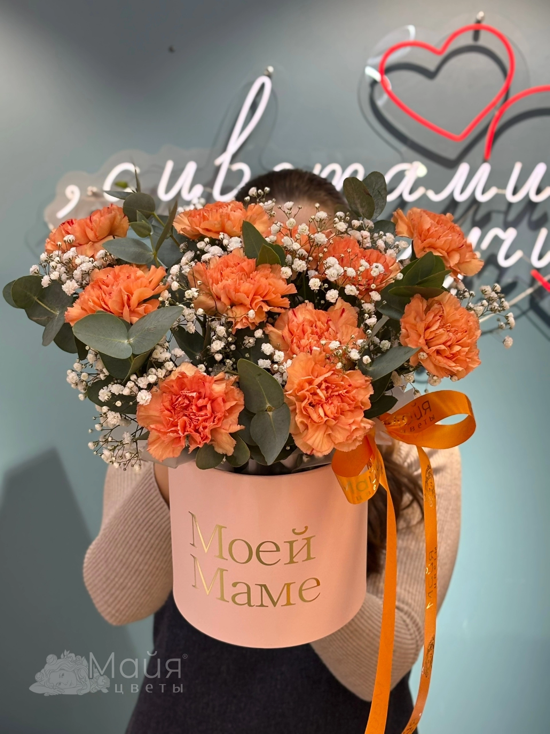 Короб 16 см, Гвоздика цветная, Гипсофила, Упаковочная бумага, Эвкалипт, Лента, Пиафлор