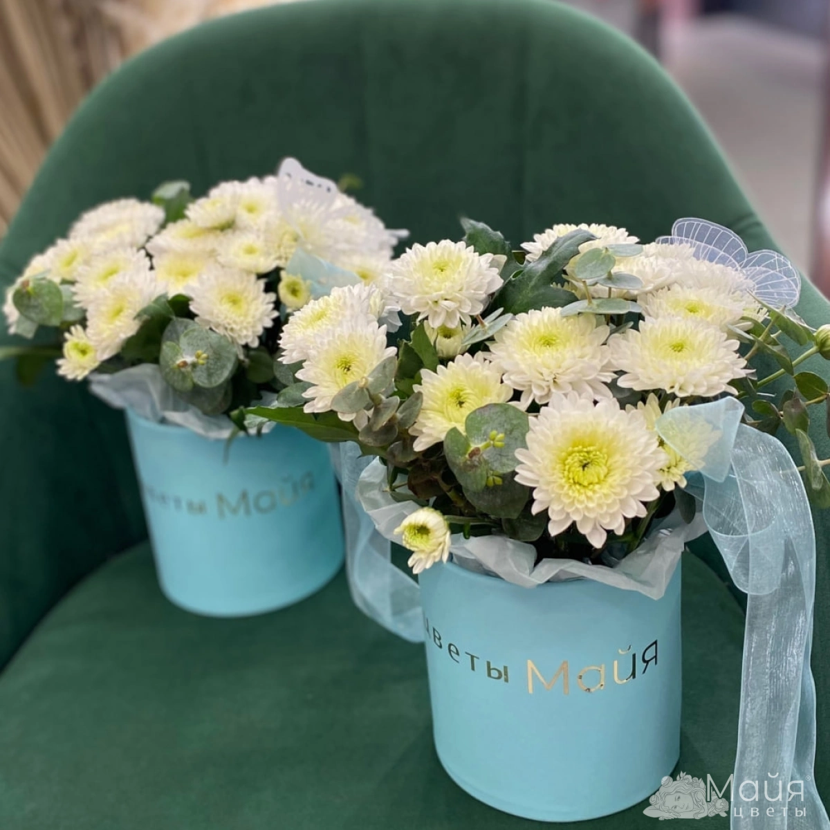 Пиафлор, Эвкалипт, Хризантема кустовая, Декор бабочки, Короб 16 см, Лента