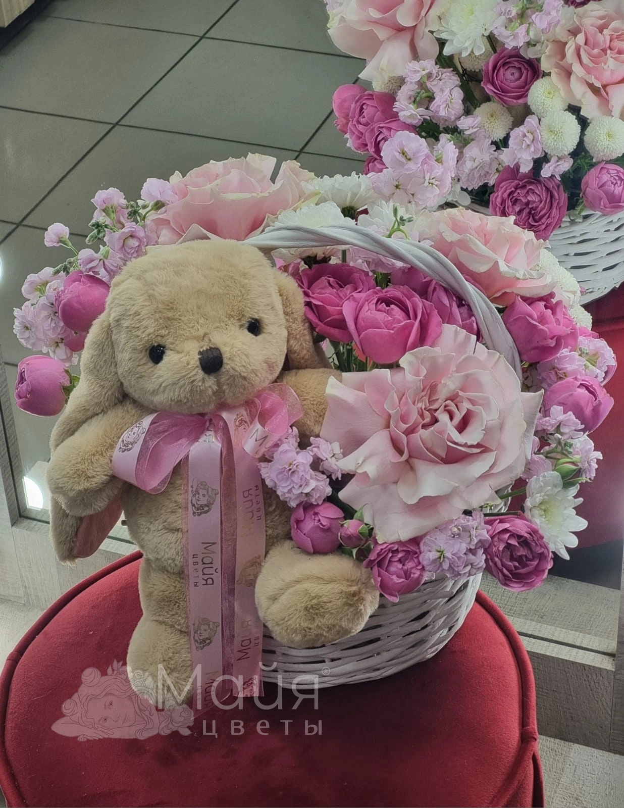 Пиафлор, Корзина плетеная Ива средняя, Игрушка зайка, Роза Эквадор 60 см, Маттиола, Хризантема кустовая, Голландская кустовая пионовидная роза 60-70 см, Лента