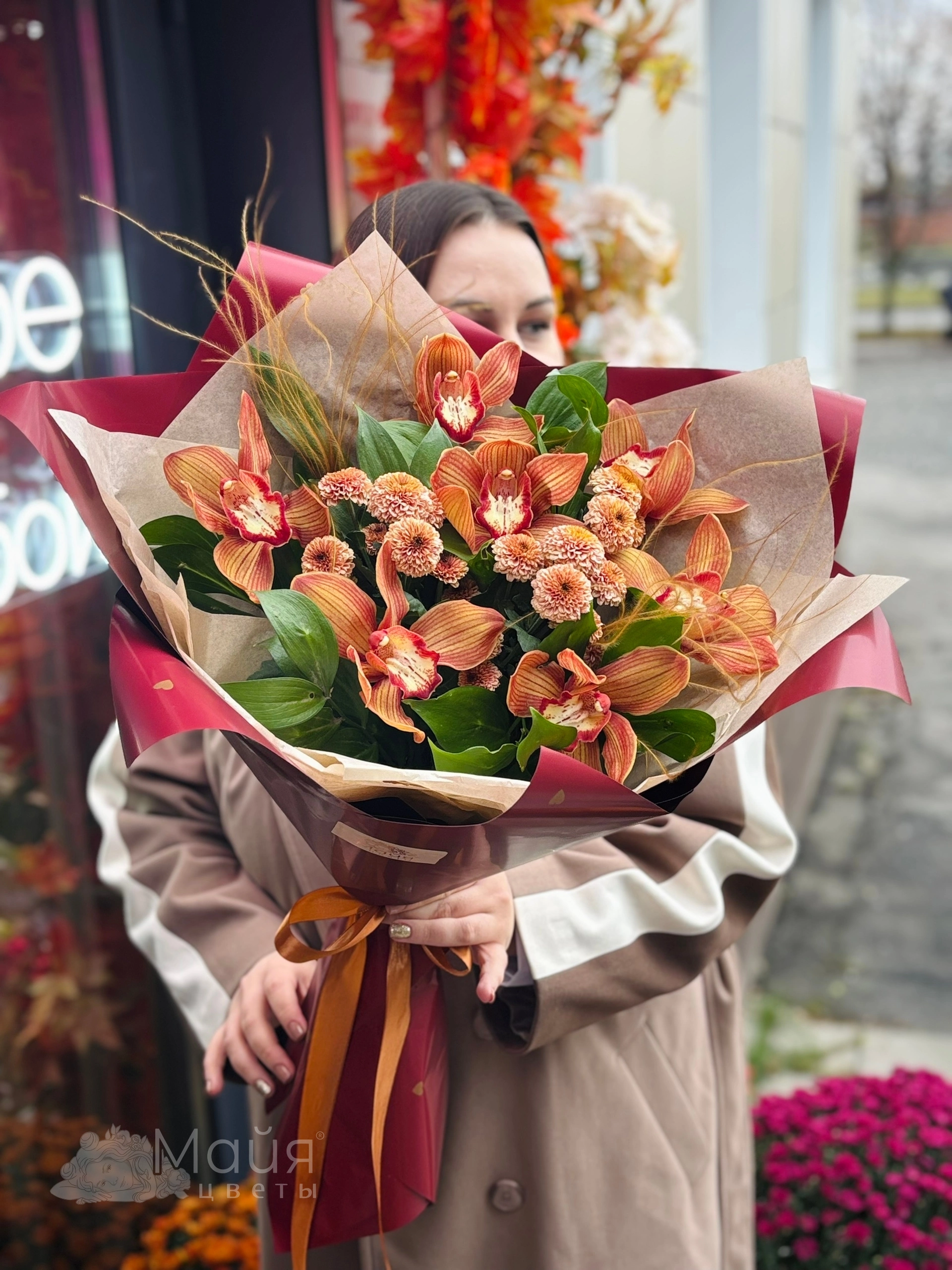 Цимбидиум, Ковыль, Рускус израиль, Лента, Хризантема Сантини, Упаковочная бумага
