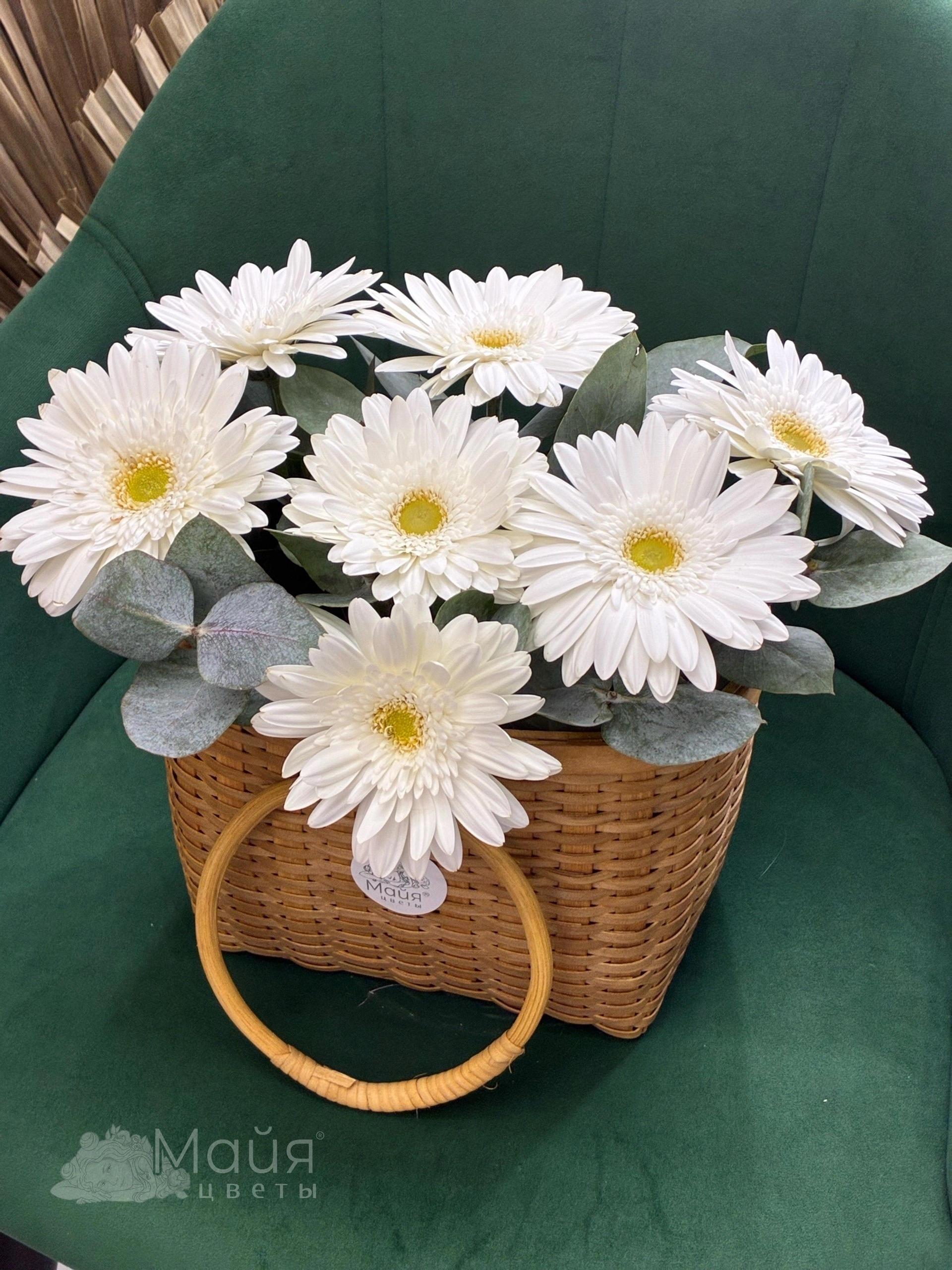 Гербера, Эвкалипт, Пиафлор, Корзина плетеная секвойя