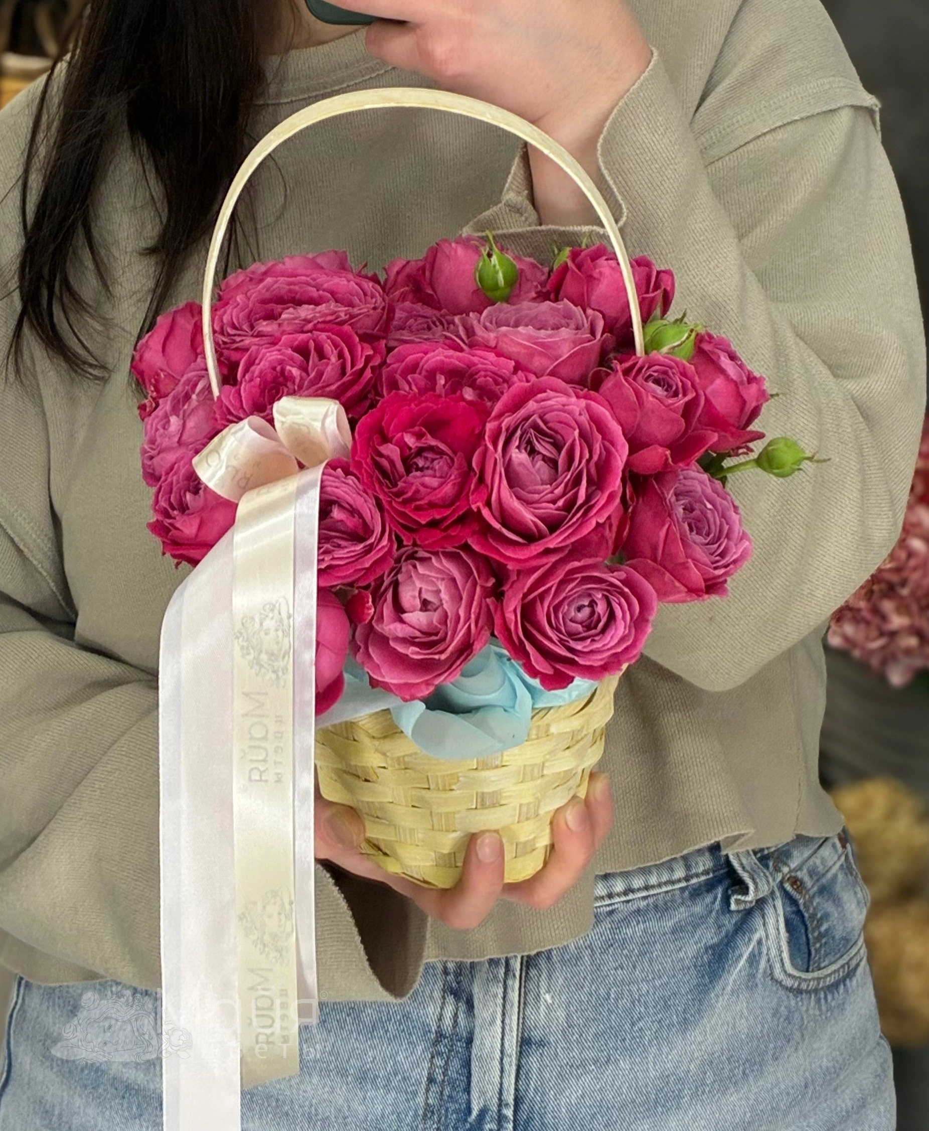 Роза Россия кустовая пионовидная 60 см., Пиафлор, Корзина мини бамбук, Лента, Упаковочная бумага