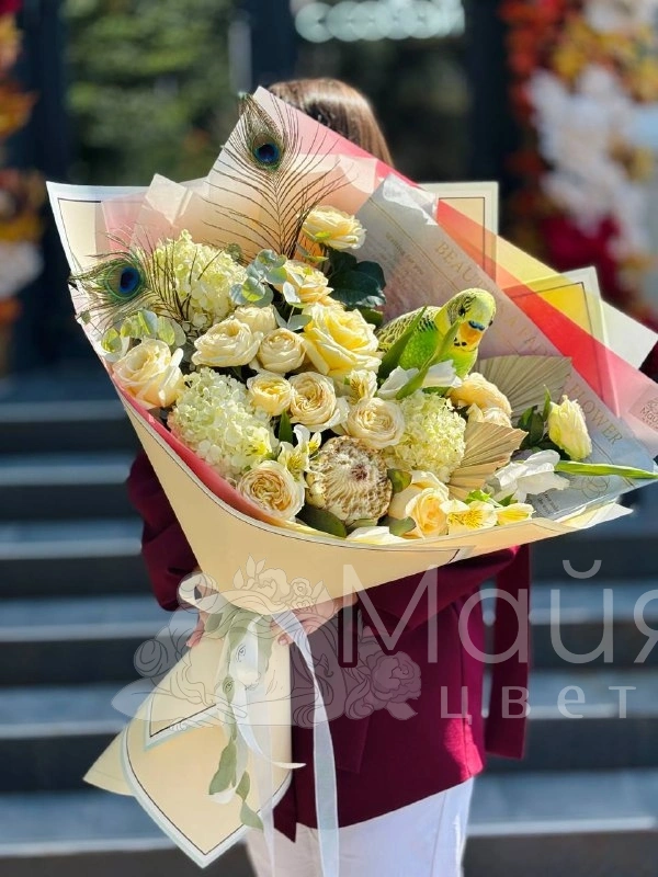 Протея, Упаковочная бумага, Лента, Альстромерия, Гортензия, Эвкалипт, Роза Эквадор Candelight 60, Роза кустовая пионовидная Голландия 80 см., Перья павлина, Мягкая игрушка "Попугай", Пальмовый лист сухоцвет