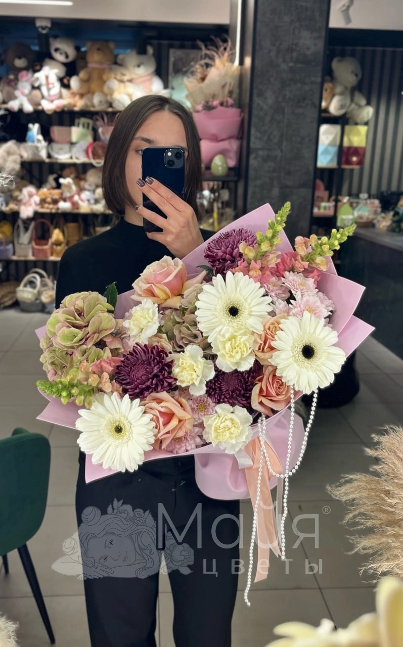 Упаковочная бумага, Лента, Гвоздика цветная, Гортензия, Хризантема кустовая, Львиный зев, Гербера, Бусы декор, Роза Эквадор 50 см, Хризантема одноголовая бигуди