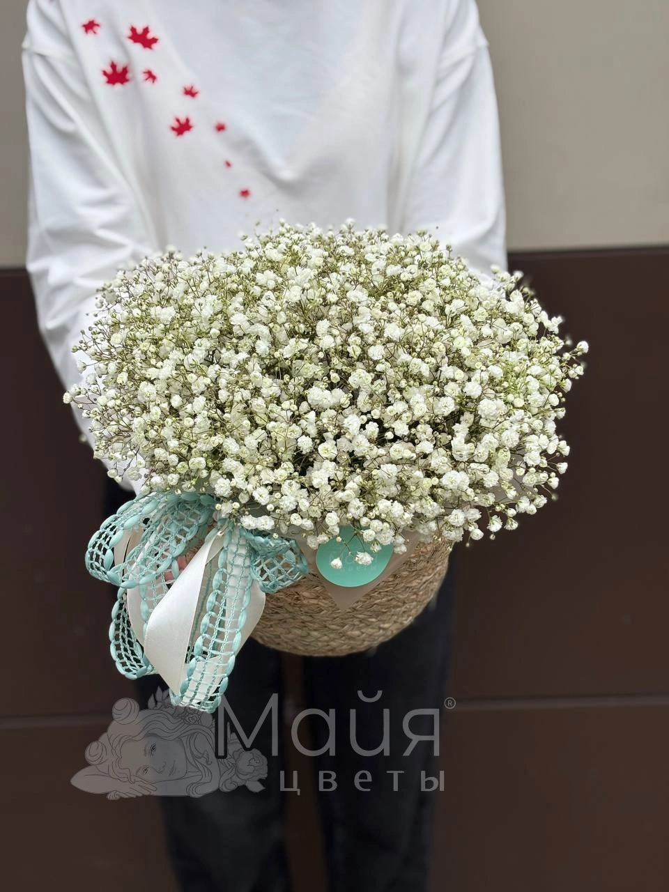 Гипсофила, Упаковочная бумага, Лента, Пиафлор, Корзина рогоз лукошко