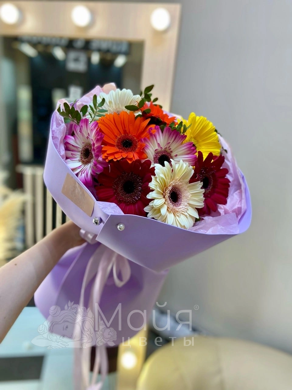 Бережная доставка прямо в руки. Вышлем фото готового букета до доставки, сделаем фото с получателем (если получатель не против).