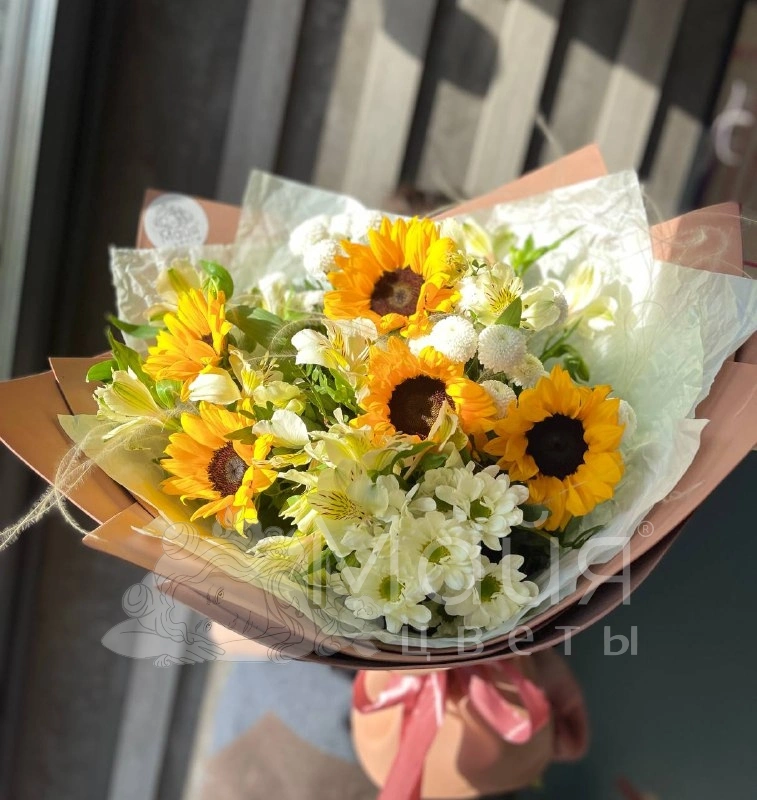 Упаковочная бумага, Лента, Альстромерия, Ковыль, Хризантема кустовая, Фисташка, Подсолнух