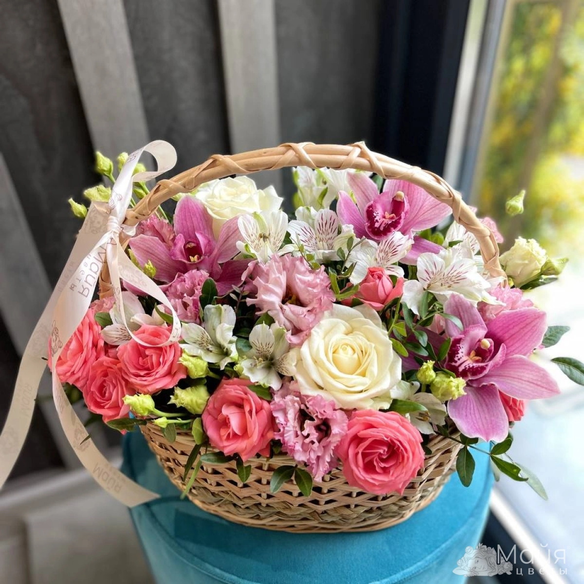 Корзина плетеная средняя, Пиафлор, Эустома, Роза Россия кустовая 70 см., Цимбидиум, Кенийская роза 40 см, Альстромерия, Фисташка, Лента