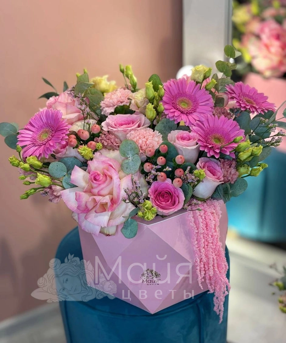 Роза Эквадор 60 см, Кенийская роза 40 см, Гербера, Эустома, Эвкалипт, Гиперикум, Лимониум, Гвоздика цветная, Короб ромб большой, Пиафлор, Амарант стабилизированный сухоцвет