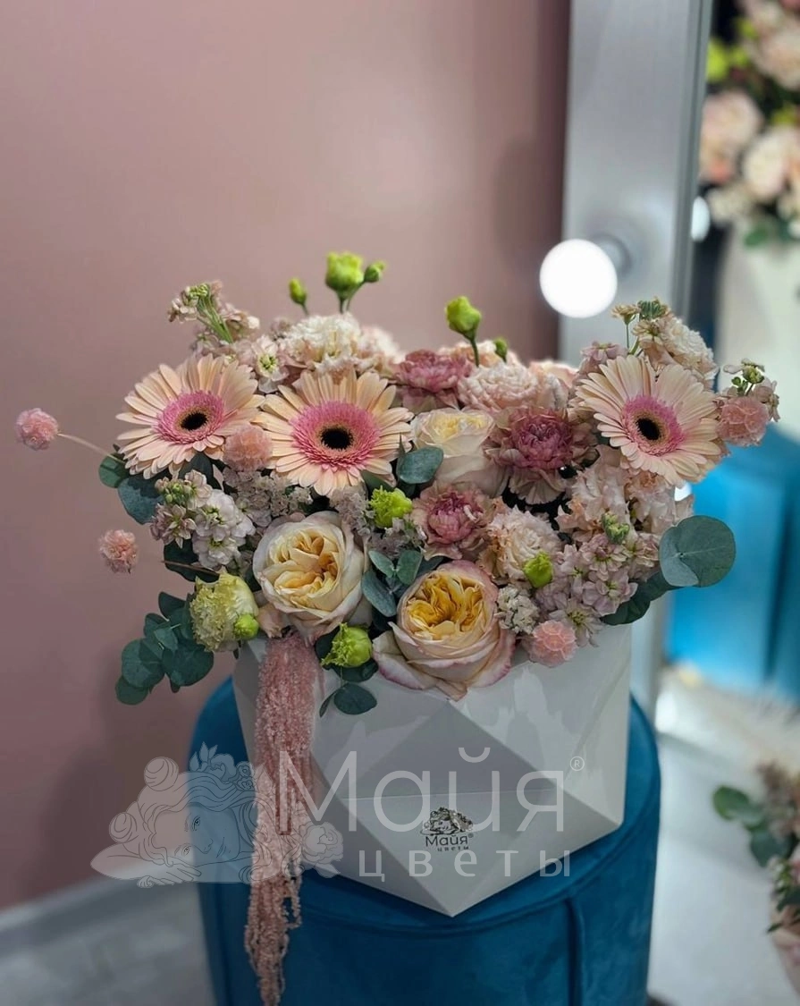 ГлавнаяКаталогКомпозицииВ шляпной коробкеБукет «Романс»