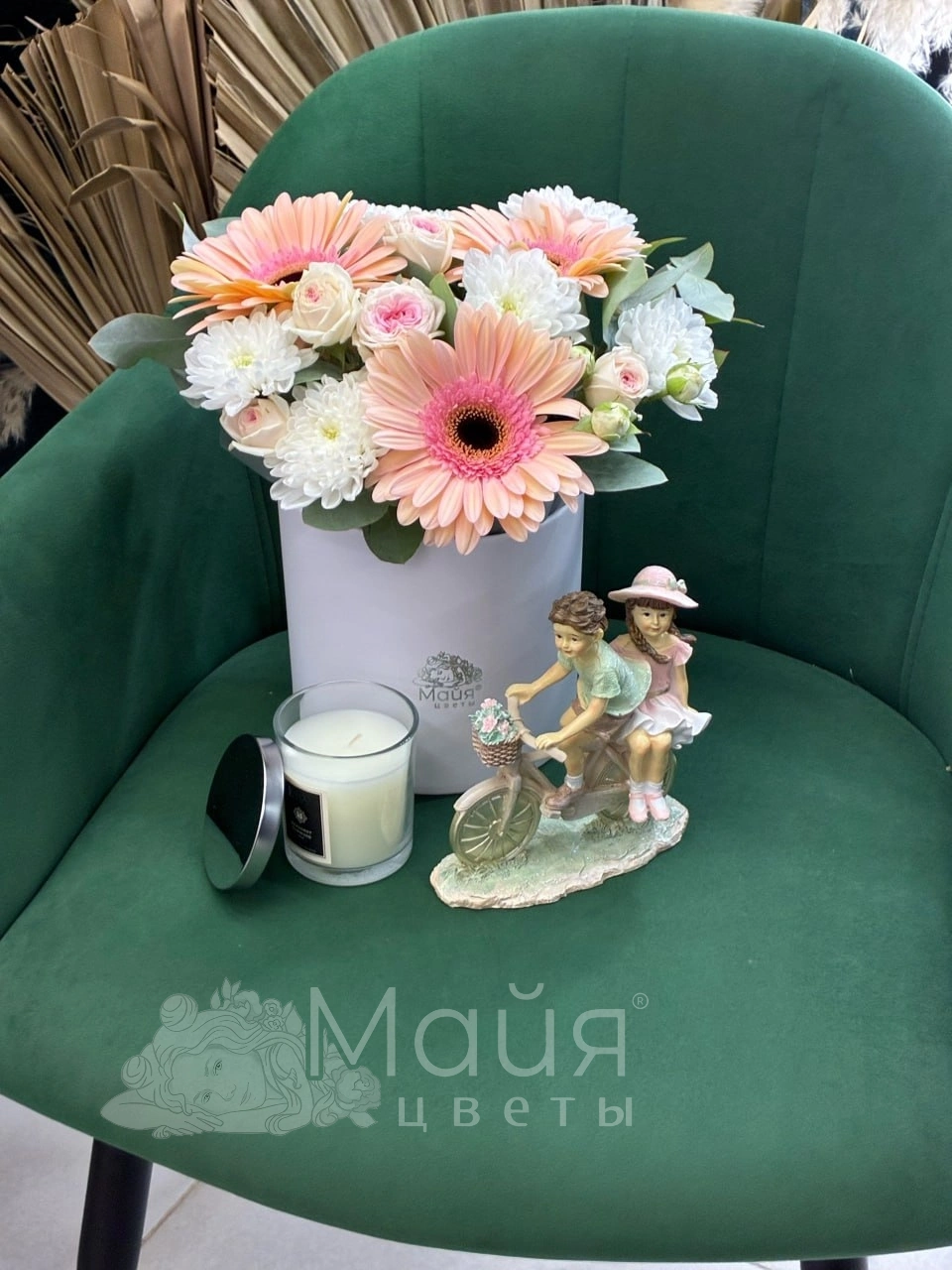 Гербера, Эвкалипт, Хризантема кустовая, Голландская кустовая пионовидная роза 60-70 см, Пиафлор, Короб 16 см, Статуэтка, Свеча
