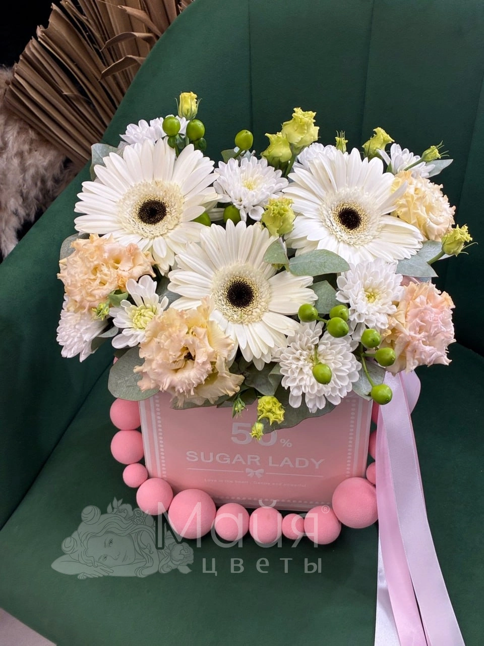 Гербера, Эустома, Эвкалипт, Хризантема кустовая, Лента, Гиперикум, Пиафлор, Короб Sugar Lady