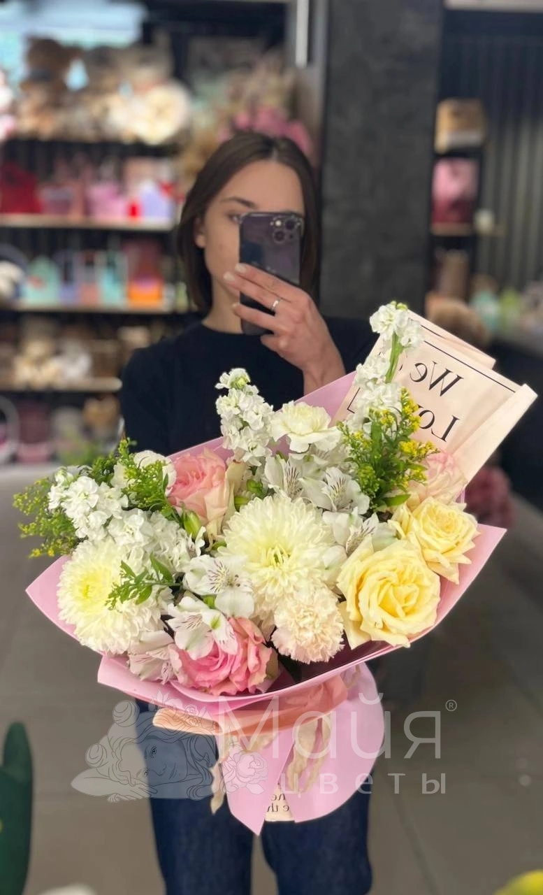 Бережная доставка прямо в руки. Вышлем фото готового букета до доставки, сделаем фото с получателем (если получатель не против).