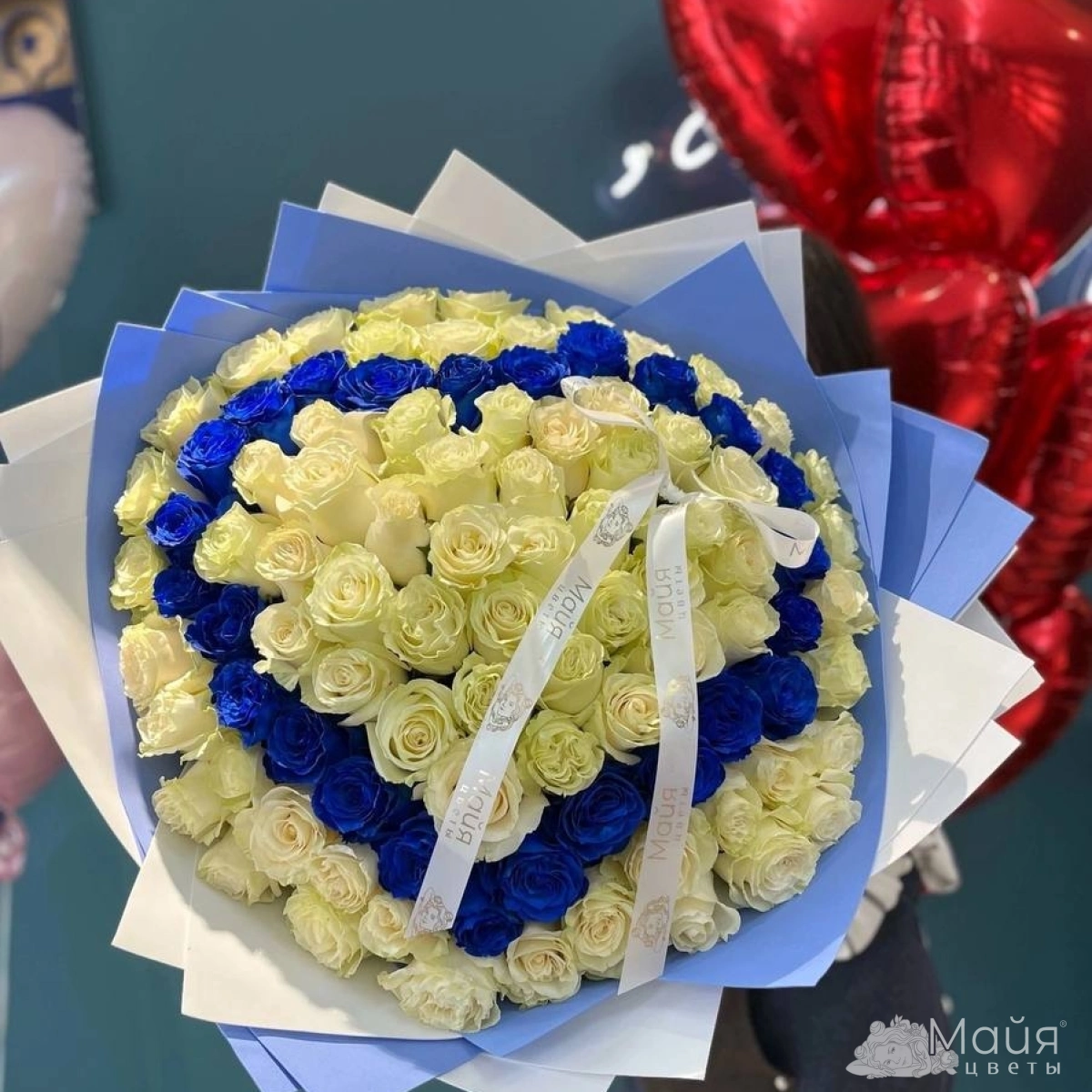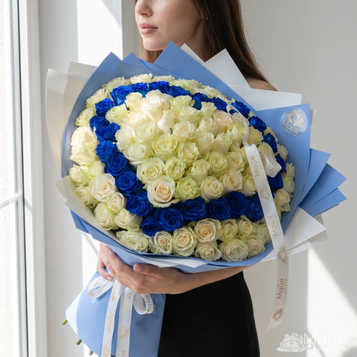 Этот величественный букет из белоснежных и насыщенно-синих роз станет воплощением элегантности и изысканности. Яркое сочетание цветов, напоминающее о небе и облаках, дарит ощущение воздушности и свежести, делая этот подарок незабываемым.