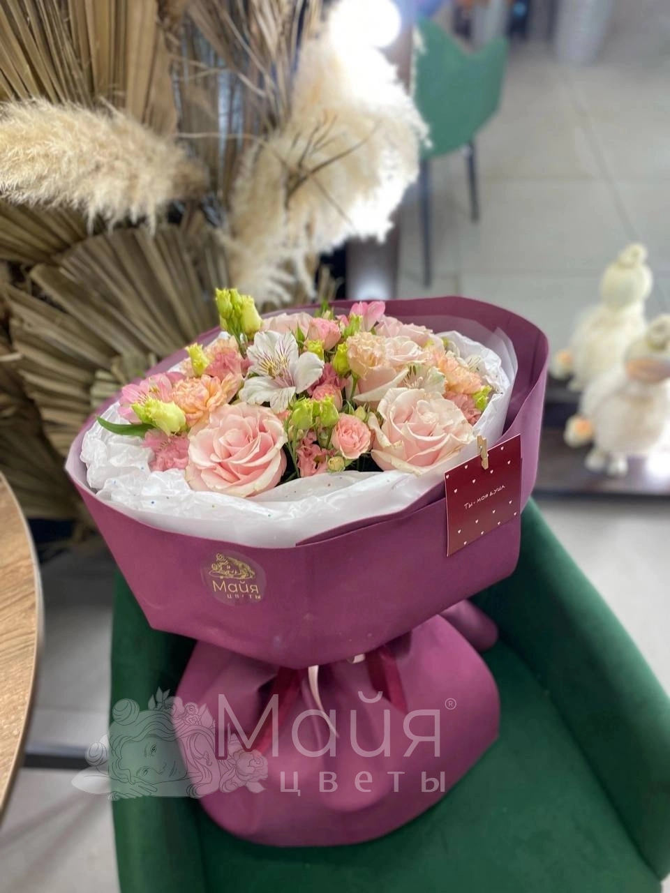 Этот нежный букет воплощение ласковых чувств и весенней свежести. Розовые розы, воздушные альстромерии и акценты изумрудной зелени создают гармоничную композицию, наполненную очарованием. Идеальный подарок, чтобы выразить свою заботу и подарить солнечное настроение.