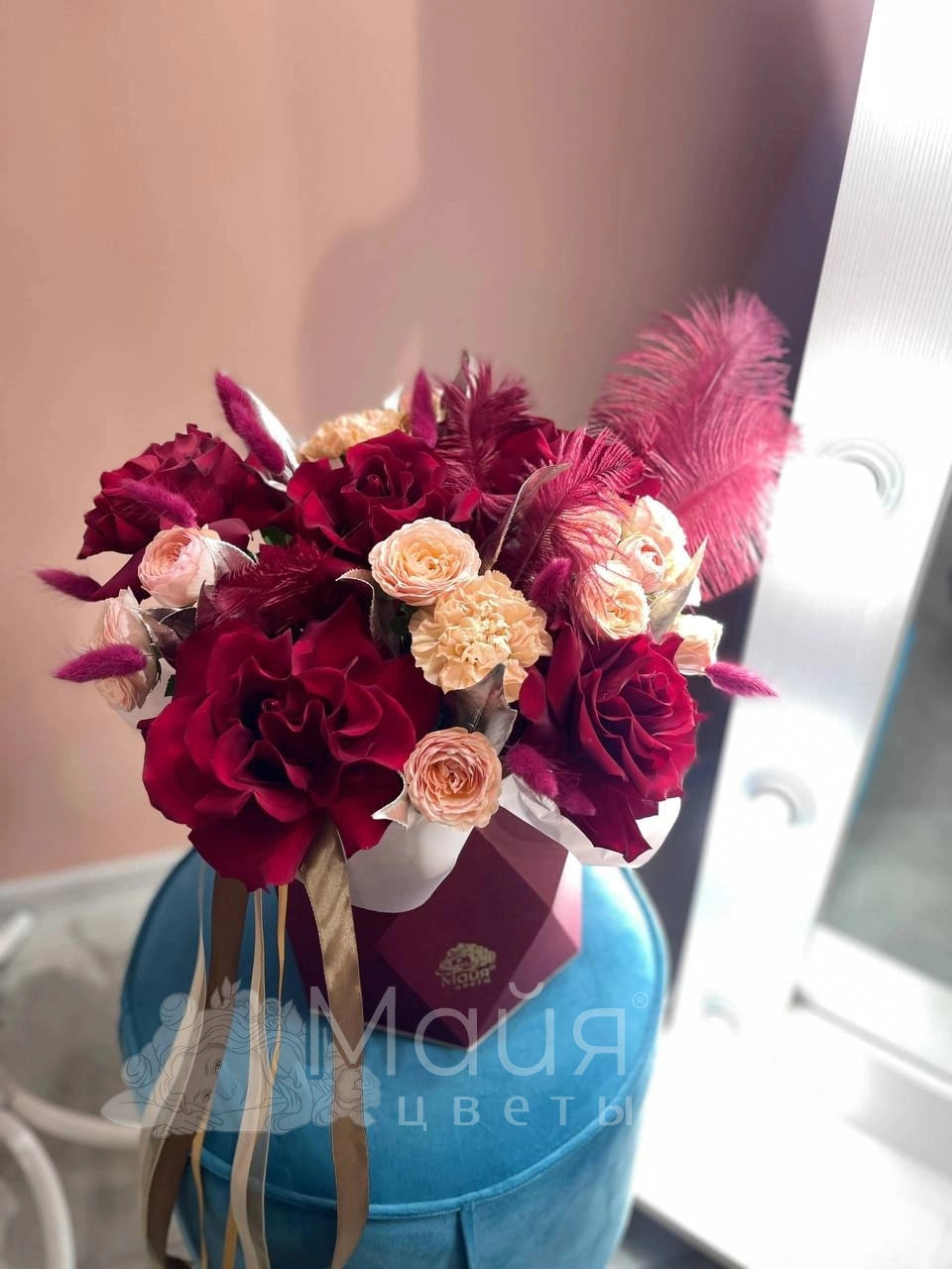 Пиафлор, Гвоздика цветная, Лагурус, Роза Эквадор 50 см, Короб ромб средний, Лента, Голландская кустовая пионовидная роза 60-70 см, Перо декоративное большое
