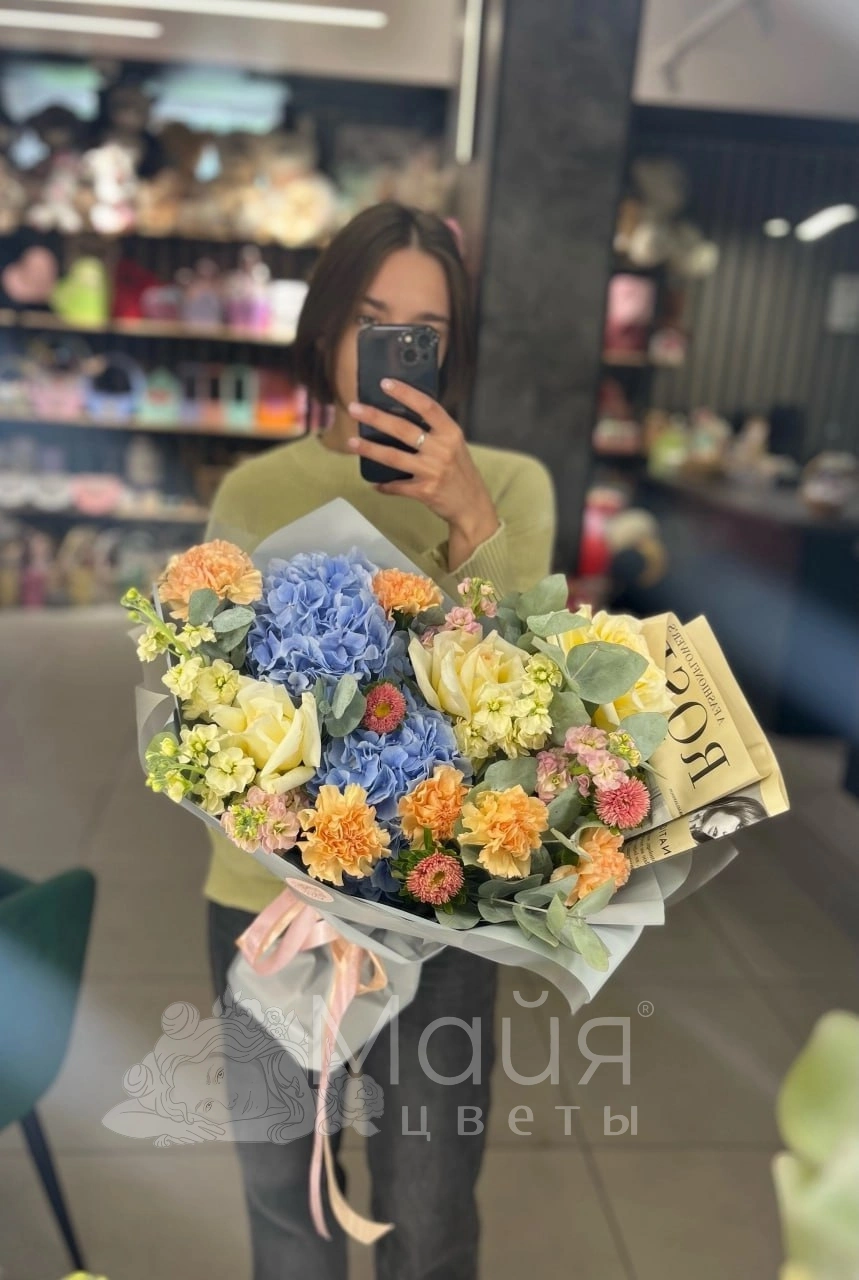 Этот букет настоящий оазис нежности и свежести. Голубые гортензии, словно летнее небо, гармонично переплетаются с кремовыми розами и персиковыми гвоздиками, создавая атмосферу уюта и спокойствия. Деликатные веточки зелени и воздушная упаковка завершают образ, делая его идеальным выбором для особого случая.
