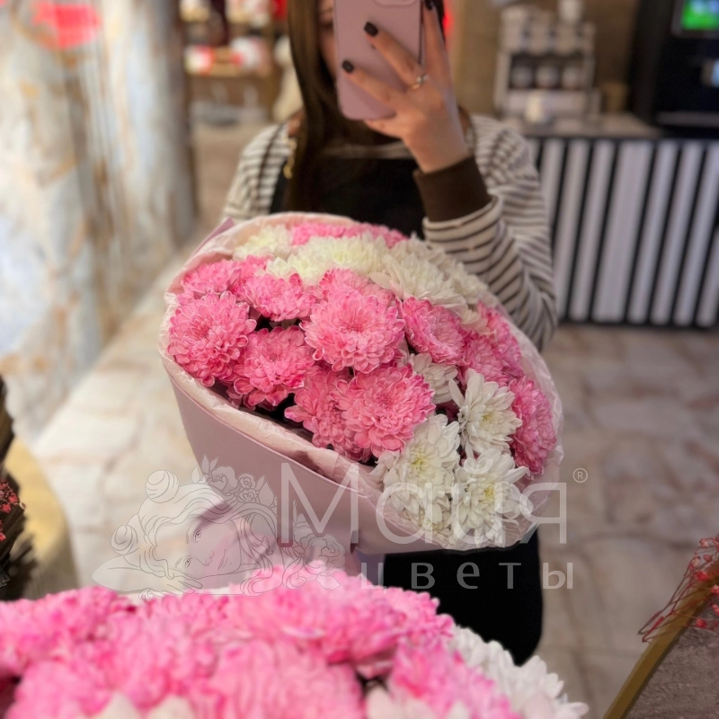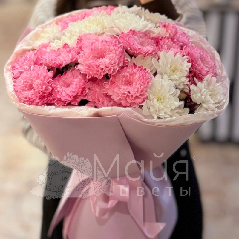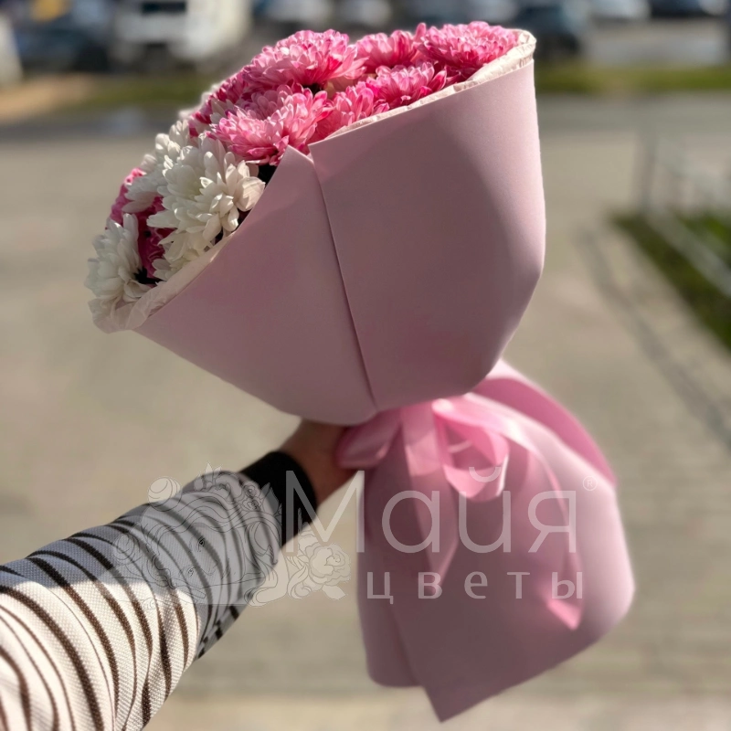 Этот букет воплощение нежности и изящества. Сочетание пышных розовых и белоснежных хризантем, окутанных в элегантную розовую упаковку, создаёт чарующий образ. Идеальный выбор для выражения тёплых чувств и привнесения ярких красок в любой день.