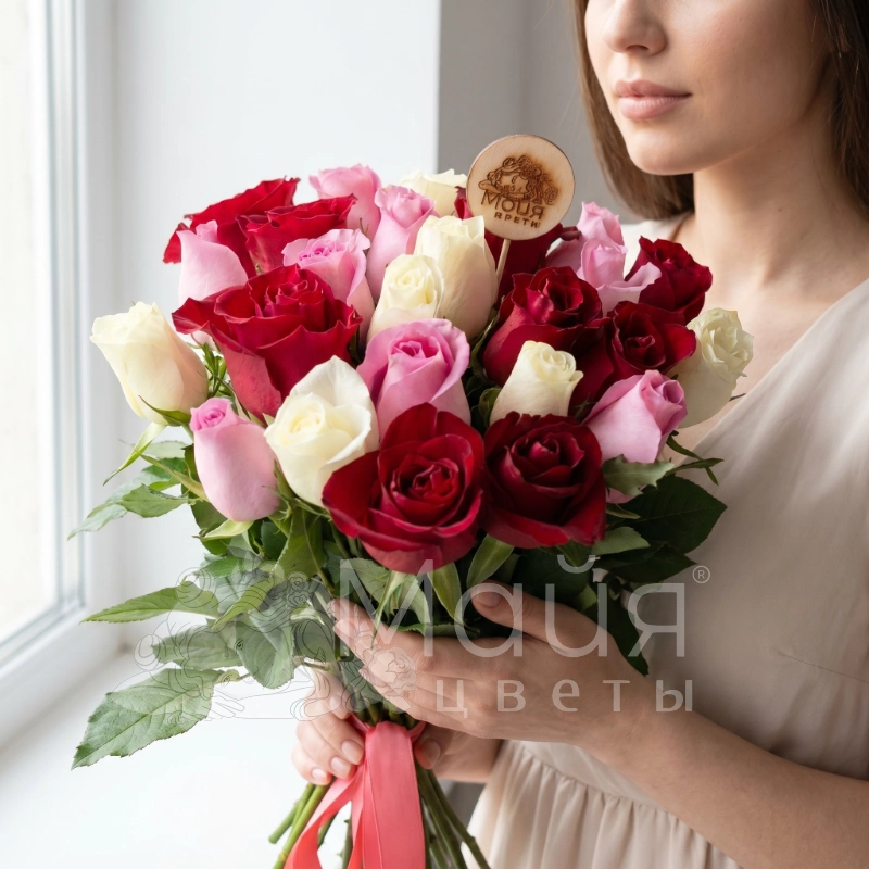 Этот букет воплощение элегантности и страсти, где глубокие оттенки красного переплетаются с нежностью розового и чистотой кремового. Он станет идеальным выражением чувств, наполненным ароматом изысканных роз.*на представленном фото букет из 25 роз.