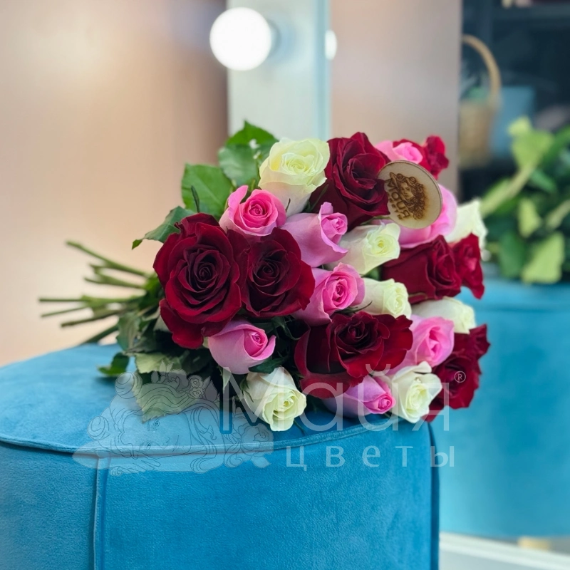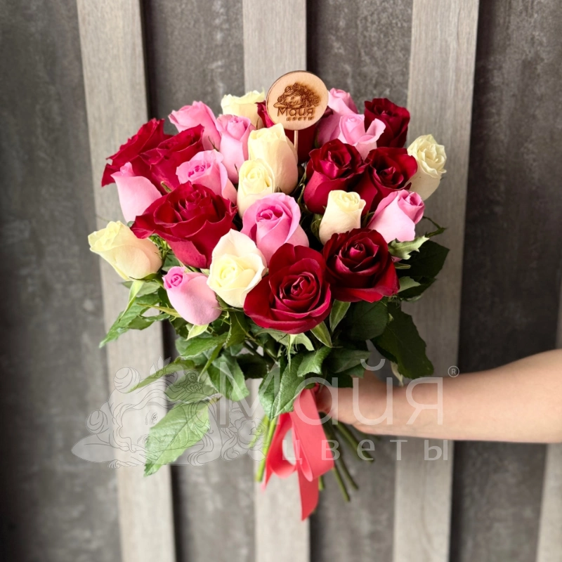 Букет из 25 Кенийский роз микс 40 см в тканевой ленте.