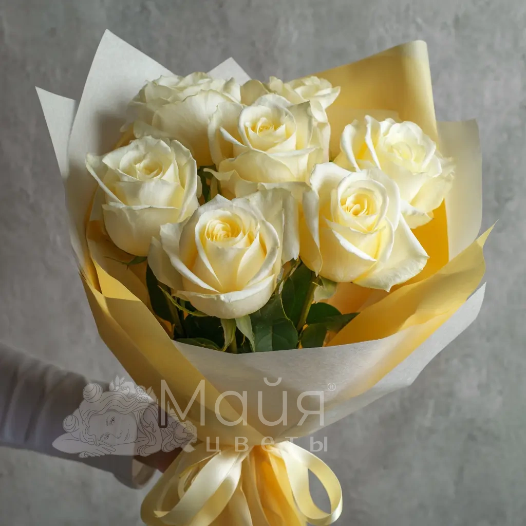 Роскошный букет, в котором белые розы сияют как благородное золото. Подойдёт для важных событий, деловых поздравлений или элегантного подарка. Совмещает утонченность и статусность.